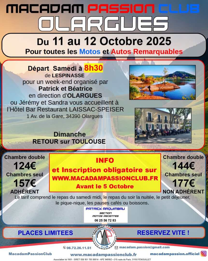 Le départ aura lieu chez Patrick et Béa à 8h30 au 18bis, rue de la Mairie 31150 LESPINASSE, avec un petit café d’accueil. Les repas seront assurés par Jérémy et Sandra à l’Hôtel Bar Restaurant LAISSAC-SPEISER 1 Av. de la Gare, 34390 Olargues Pour l’hébergement, l’hôtel dispose de 16 couchages avec des lits couples et lits doubles, et un gîte situé dans la même rue, en face de l’hôtel, propose 22 couchages supplémentaires… Les réservations doivent être bouclées au plus tard le 5 octobre, selon les places disponibles… La première partie du parcours est programmée sur 68° Voici le lien pour le télécharger : https://api.68deg.com/api/deeplink/?uuid=8c4394d2 Pour la suite, Patrick nous communiquera les parcours sur place, au fur et à mesure. Les tarifs proposés comprennent le repas du samedi midi, le repas du soir, la nuitée, le petit déjeuner, le pique-nique, les pauses cafés. Ne sont pas compris l’essence des véhicules, les apéros et les achats personnels.